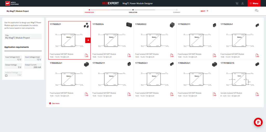 Redexpert, eine Online-Plattform für die einfache Auswahl, Simulation und Design-In von Würth-Elektronik-Bauelementen, hat eine neue Funktion erhalten: Der MagI³C Power Module Designer soll die schnelle leichte Integration eines Power Moduls in eine Applikation ermöglichen, ohne dass dazu tiefere DC/DC-Wandler-Kenntnisse nötig sind. Das Tool leitet Entwickler Schritt für Schritt durch den gesamten Auswahl- und Konfigurationsprozess. Der automatisch erstellte Design-Vorschlag wird inklusive Stückliste als PDF-Datei ausgegeben. Das Tool bietet zudem eine direkte Bemusterung der ausgewählten Bauteile des Unternehmens an.