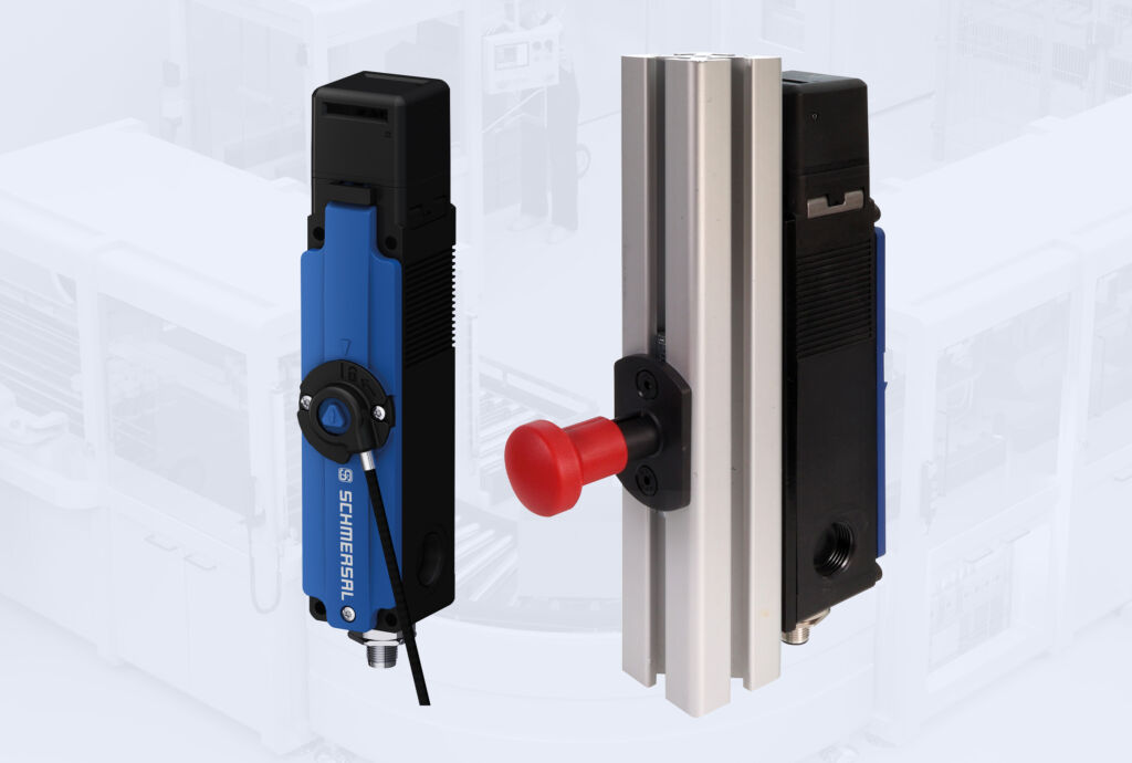Die schlanke Sicherheitszuhaltung AZM150 von Schmersal bietet mit neuem Zubehör vielseitigere Einsatzmöglichkeiten. Neu ist der rückseitig montierbare Schlagtaster als Fluchtentriegelung oder Notentsperrung. Er ist in zwei Varianten erhältlich: Die 45mm-Variante für den Einsatz bei Türholmstärken von z.B. 40mm, wobei die Montage mit der Montageplatte MP-AZM150-1 erfolgen kann, sowie die 170mm-Variante für den Einsatz bei Türholmstärken von max. 170mm. Ebenfalls neu ist die Bowdenzugentriegelung mit einer Gesamtlänge von 6m, die bei einer nicht erreichbaren Anbausituation der Zuhaltung eine Fernentriegelung ermöglicht. Der 360° drehbare Betätigerkopf wird durch einfaches Aufsetzen des Deckels arretiert.